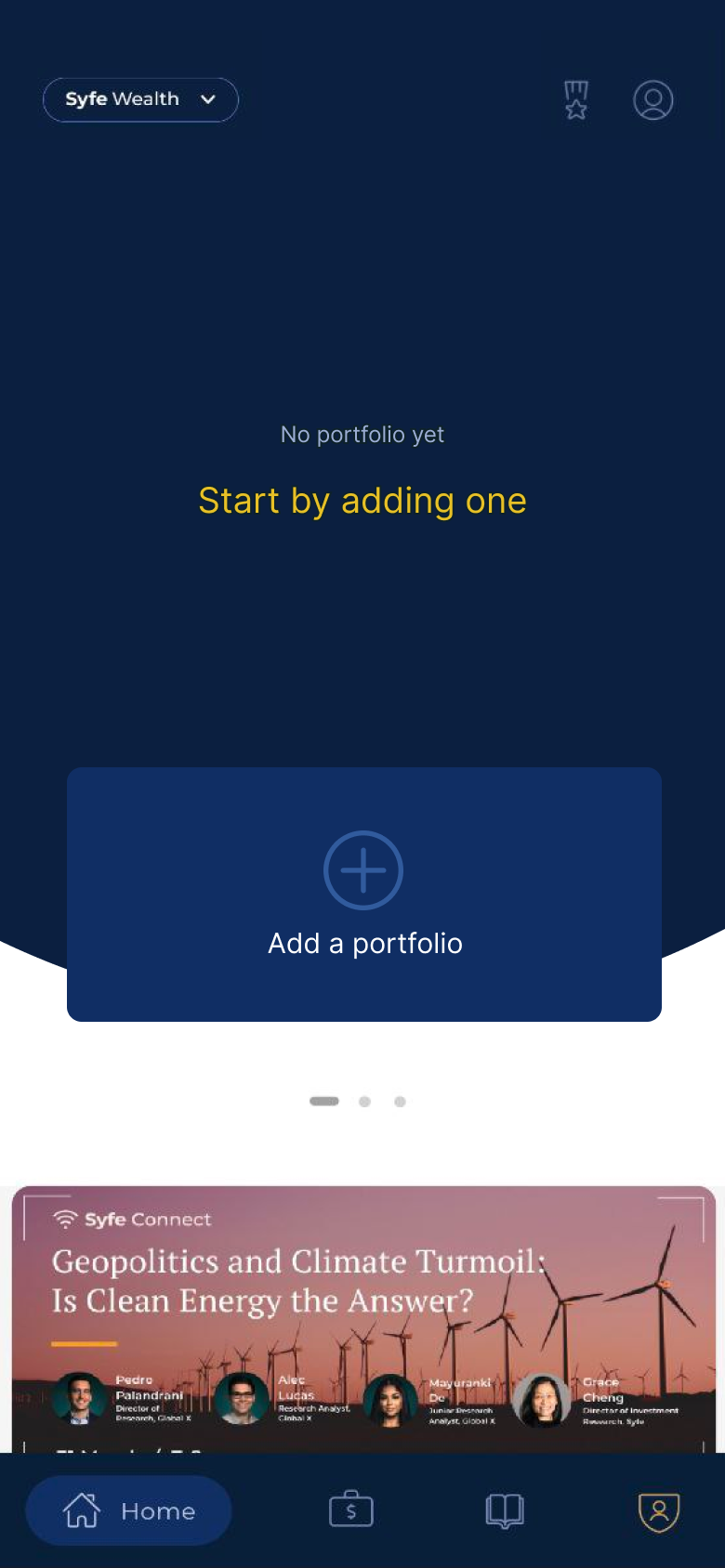 These screens remind users of Syfe's unique selling points and encourage users to log in or sign up.